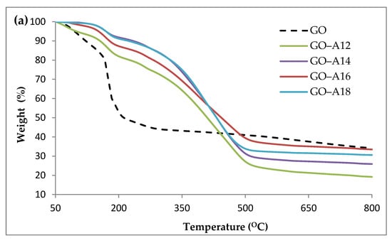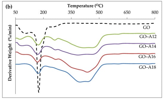 TGA was used to investigate the thermal stability of the samples. Figure 3 depicts the (a) thermogravimetric (TG) and (b) derivative thermogravimetric (DTG) thermograms of GO and functionalized GO. Pristine GO showed a major weight loss of about 80% in the temperature range of 110–230 °C corresponding to the decomposition of labile oxygen-containing functionalities and illustrating a lower thermal stability. A low level of decomposition of the GO around 260 °C is due to more stable oxygen-containing functional groups and the bulk pyrolysis of the carbon skeleton []. The functionalized GO showed less than 10% weight loss below 100 °C, which indicated an enhanced hydrophobicity that minimized the amount of adsorbed water [], compared to the pristine GO which usually exhibited a weight loss of about ~18%, corresponding to the evaporation of the trapped water molecules in the GO []. The major weight loss of the functionalized GO of about ~60% in the range of 300–550 °C was attributed to the thermal decomposition of the alkylamine chains. The DTG results suggested there were multiple processes occurring in the decomposition of the alkylamine in the region. The lower degradation temperature in the region may be attributed to the loss of small fragments of alkylamine that were physically adsorbed on the GO surfaces (free alkylamine). The physically adsorbed alkylamines are weaker than the alkylamines that had chemically grafted onto the GO surface. These, therefore, had a lower decomposition temperature []. The higher degradation temperature was supported by the degradation of the chemically-grafted alkylamine that intercalated between the GO sheets []. The thermal stability of functionalized GO increased substantially below 550 °C with increasing chain length of the grafted alkylamine.