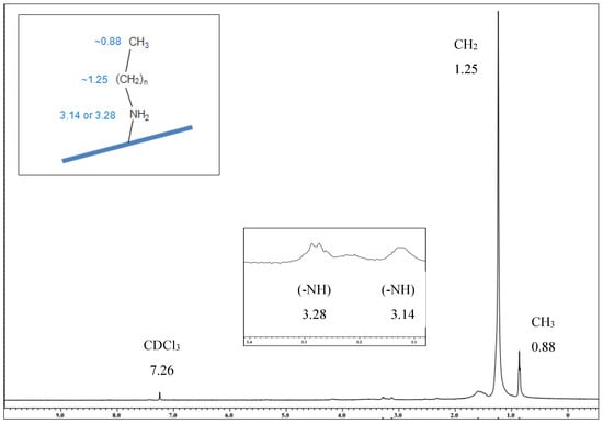 NMR was used to elucidate the bonding chemistry between the alkylamine and the GO after functionalization. The NMR results of GO–A18 investigation is presented in Figure 4. The peak at ~7 ppm is assigned to the CDCl3 solvent. The 1H NMR spectrum shows the presence of the alkylamine chain on the sample by several signals at 0.88 ppm (–CH3, small intensity) and 1.25 ppm (–CH2, very intense). It also showed a small peak around 3.14 ppm and 3.28 ppm which corresponds to the H peak of (–NH), which supports the reaction of the alkylamine with the GO [,,]. Based on these results, it was confirmed that the γ-ray irradiation technique had successfully functionalized GO by the attachment of an alkylamine to the surface of the GO. The peak at ~1.56 ppm was due to moisture present in the sample. This moisture may have come from the NMR tube, the surrounding atmosphere, or the sample itself which may not have been completely dry.