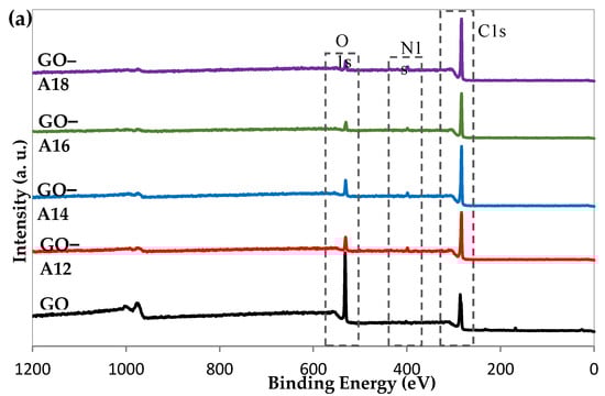 FTIR analysis can be used as direct evidence for the functionalization of GO as it provides information about functional groups that are present in the sample. FTIR spectra of GO and functionalized GO are presented in Figure 2a. Generally, GO shows typical broad peaks at ~3340 cm−1 which is associated with hydroxyl groups, while the peak at 1717 cm−1 corresponds to carboxyl groups. The peak at 1625 cm−1 corresponds to a C=C bond in an aromatic ring and the peak at 1060 cm−1 is for C–O–C arranged in an epoxide ring [,,]. This indicates that the solution of concentrated H2SO4 containing KMnO4 is capable of oxidizing graphite to GO with a high product yield, even without the assistance of NaNO3, as used in Hummers method. Thus, the FTIR data verifies the existence of oxygen-containing functional groups on GO. Upon functionalization with various alkylamines through γ-ray irradiation, the peaks around 2920–2852 cm−1 appeared, corresponding to the C–H stretching vibration of the alkyl chain (CH2), together with a peak around ~728 cm−1. Of note is that the absorbance of the –CH2 peaks increases as the length of the alkyl chain of increases, for example, GO–A18 compared to GO–A12. This result is comparable with the studied by Shanmugharaj et al. [] and Yan et al. [].