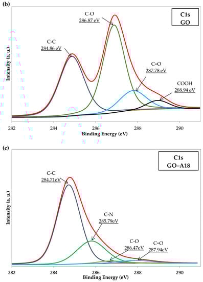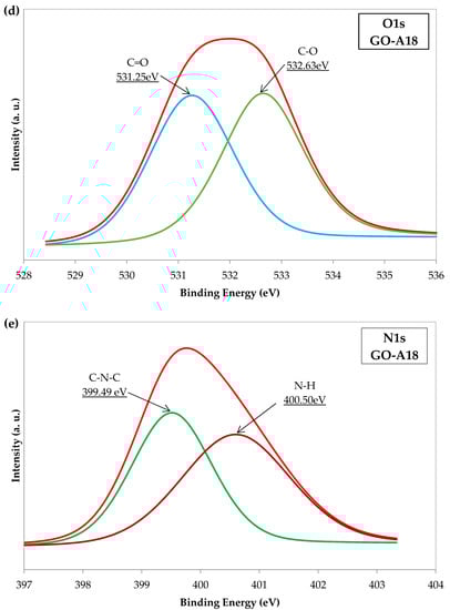 Additionally, the successful reduction and functionalization is also proved by XPS analysis and the results are displayed in Figure 5. Survey scan results of the GO showed two strong peaks at 280 eV and 532 eV, which correspond to C1s and O1s peaks, respectively (Figure 5a). Functionalization of long alkylamines on the GO surface resulted in a significant increase in the intensity of the C1s peak (280 eV) with an extreme attenuation of the O1s peak (532 eV) which was also found by Zhang et al., []. The functionalization was also corroborated by the decrease in the O/C ratio from 2.34 (GO) to 0.30 (GO–A18), as shown in Table 2. Of the success of the functionalization is further revealed by the appearance of a new peak at 400 eV (N1s) (Figure 5a), which is further confirmed by the rise in the N/O ratio (Table 2). Deconvolution of the high-resolution spectra (C1s, O1s and N1s) was carried out and a few representative results are included in Figure 5b–e. The resolution of the XPS spectrometer does not allow the separate analysis of the C–C and C=C peaks, therefore it was treated as a single signal and compared with the peaks corresponding to the carbon atoms bound to other groups. Deconvolution of the C1s spectra of pristine GO showed four major peaks that correspond to C–C/C–H (284.79 eV), C–O (287.00 eV), C=O (288.62 eV) and COOH (290.51 eV). This indicates a considerable degree of oxidation of GO, which indicates the presence of new oxygen-containing functional groups in the GO structure []. In addition, the functionalization of GO with alkylamines such as octadecylamine (GO–A18) resulted in a significant rise in the C–C/C–H peak and a drastic decrease in the peaks corresponding to C–O, C=O and COOH, along with the appearance of a peak at 285.79 eV (C–N) []. The information provided by the analysis of the O1s spectra complements the information provided by the analysis of the C1s spectra. In comparison to the changes in the C1s peaks upon functionalization, there is sudden decrease of the C–O and C=O peaks, and hence only two peaks appeared in the deconvoluted O1s spectra. This fact is further revealed from the deconvoluted N1s spectra, which showed two peaks at 399.49 eV (C–N) and at 400.50 eV (N–H).