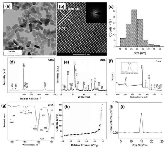 (a) Transmission electron microscopy (TEM) images; (b) selected electron diffraction (SEAD) pattern; (c) Size distribution; (d) Raman spectrum; (e) X-ray diffraction (XRD) pattern; (f) X-ray photoelectron spectroscopy (XPS) spectrum; (g) Fourier transform infrared spectrometry (FTIR) spectrum; (h) Brunauer-Emmett-Teller (BET) results and (i) Pore size distribution of synthesized carbonated hydroxyapatite (CHA) nanorods.