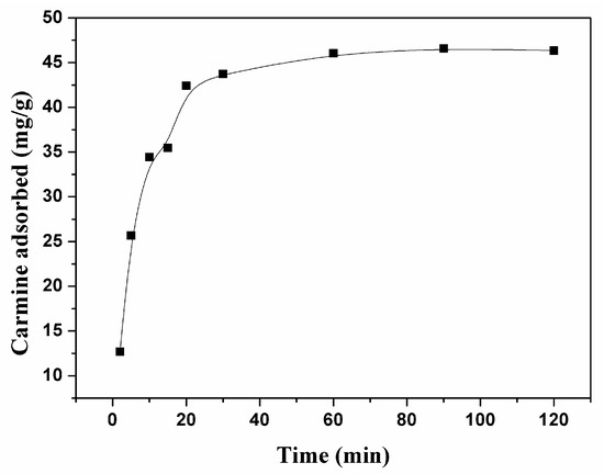 Adsorption activities of CHA nanorods for carmine with different contact times.