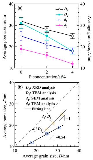 The change dependency of grain size, D (D1 from XRD analysis; D2 from TEM analysis), and pore size, d (d1 from SEM analysis; d2 from TEM analysis), on the P concentration (a) and the linear dependency of d1/D1 and d2/D2 (b).