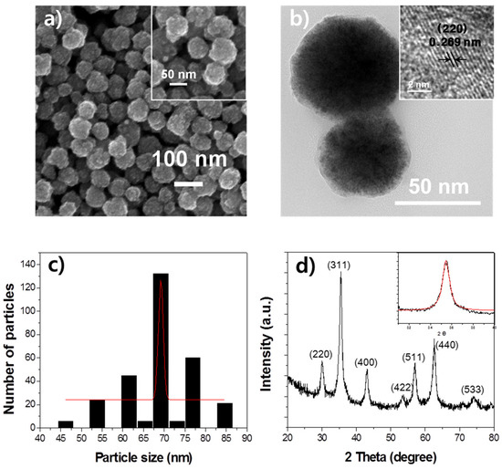 The morphology and particle size of the as-prepared CoFe2O4 nanoparticles were characterized by transmission electron microscopy (TEM; JEOL, JEM-2100F) and scanning electron microscopy (SEM; Hitachi, SU-70), as shown in Figure 1a,b, respectively. The SEM and TEM images showed that these nanoparticles composed of irregular nanograins are spherical and have a diameter of approximately 70 nm with a rough surface. In addition, the sizes of these nanoparticles were quite uniform. The high-resolution TEM image on the edge of a nanoparticle indicated that the distance between two neighboring planes was 0.269 nm at (220), which is in good agreement with the (220) plane of the spinel CoFe2O4, as shown in the inset of Figure 1b. Figure 1c shows a histogram of the distribution of the nanoparticles size with a Gaussian fit curve (solid line); the particle size ranged from 45 to 85 nm, and the average particle size (DSEM), defined as the size at the peak of the Gaussian-fitting curve, was 69.2 nm. These results indicated that our CoFe2O4 nanoparticles were well dispersed and had a narrow size distribution.