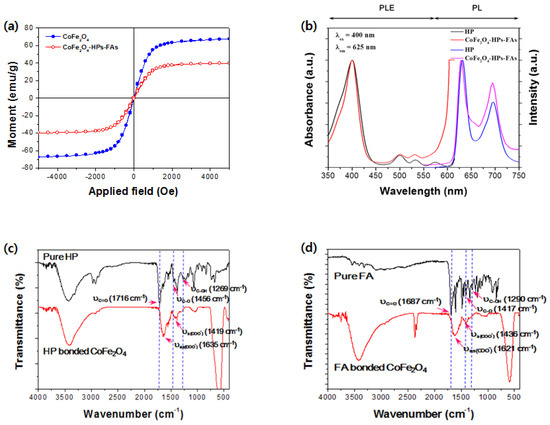 To confirm the formation of the metal-organic complex, the Fourier Transform InfraRed (FT-IR) spectra of pure HP, HP-coated CoFe2O4, and FA-coated CoFe2O4 nanoparticles were compared. As shown in Figure 2c,d, the absorption peaks were mainly detected in the fingerprint region. Before complex formation, the IR spectra of pure HP and pure FA exhibited a peak in the range of 1687–1716 cm−1, indicating the presence of a C=O stretching band of the -COOH groups. In addition, coupled vibrations involving C-O stretching and the O-H deformation (υC-OH) were observed in the range of 1417–1456 cm−1 and 1269–1290 cm−1, respectively. These results indicate that the pure HP and FA molecules have protonated carboxyl groups (-COOH), as previously described [22]. After the carboxyl acid was converted to the complexes, the IR spectra of HP-coated CoFe2O4 and FA-coated CoFe2O4 nanoparticles showed that the absorption bands of the protonated carboxyl groups significantly changed. Three absorption bands corresponding to the stretching vibrations of the C=O group, (C-O), and υC-OH of the -COOH group at 1260–1720 cm−1 disappeared, whereas the bands assigned to asymmetric vibrations υas(COO), at 1621–1635 cm−1, and symmetric vibrations υs(COO), at 1419–1436 cm−1, appeared. These spectral changes can also be caused by the formation of cation–carboxylate complexes owing to covalent chemical bonding, as described previously [22,23].