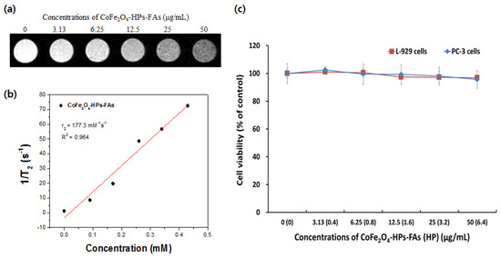 As superparamagnetic CoFe2O4 nanoparticles are good T2-type (negative) contrast agents in MRI, and FA and HP are biocompatible cancer-targeting and therapeutic agents, the anti-cancer effect of CoFe2O4-HPs-FAs was investigated by evaluating the MR signal-enhancing property. With increasing concentrations of CoFe2O4-HPs-FAs in the cells, the MR signal was significantly enhanced (negative in brightness in the T2-weighted image) in vitro (Figure 4a). These results indicate that the nanoparticles can generate high magnetic-field gradients near the surface of the CoFe2O4-HPs-FAs. Additionally, the relaxivity r2 (1/T2) increases linearly under these conditions (Figure 4b), indicating that the CoFe2O4-HPs-FAs generated MRI contrasts on T2-weighted spin-echo sequences. Transverse relaxivity r2 values were determined from the slope of the linear fit to the data points in 1/T2 vs. the CoFe2O4-HPs-FAs concentration plot. The r2 value obtained for CoFe2O4-HPs-FAs was 177.3 mM−1s−1. As shown in Figure 4a,b, the T2-weighted phantom images of the CoFe2O4-HPs-FAs exhibited a significant negative dose-dependent contrast enhancement, suggesting that these nanoparticles are promising for theragnostic purposes.