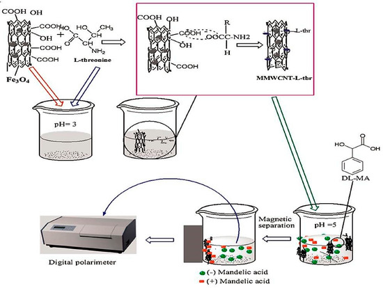 l-threonine was immobilized on the surface of MMWCNTs through electrostatic and hydrogen bonding [51]. A successful chiral separation of dl-mandelic acid was performed by MMWCNTs-l-threonine which was then analysed using a digital polarimeter [51]. This showed that strong hydrophobic and hydrogen bonding interactions occurred between MWCNTs-l-threonine and the (+)-isomer of mandelic acid more than (−)-isomer. The role of l-threonine as a chiral selector was enhanced by its immobilization on the surface of MWCNTs [51]. Thereafter, MMWCNTs have been separated from the solution using a magnetic field in an efficient and quick process. This method offers many advantages over traditional techniques such as being easy, reproducible, inexpensive and reliable [51].