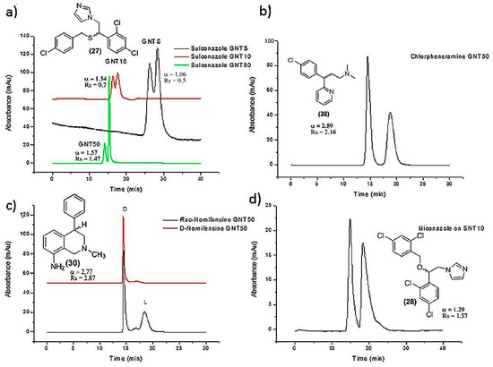 Effect of chiral SWCNTs on the enantioseparation of pharmaceuticals in nano-HPLC “Reproduced with permission from M. Ahmed et al. [46]. Copyright Elsevier, 2014”. Chromatograms obtained for the enantioseparation of (a) sulconazole on GMA-columns coated with different SWCNTs concentrations with 45:55 v/v methanol to water (0.1% TFA) at 240 nm; (b) chlorpheniramine on GNT50 with 40:60 w/w methanol to water (0.1% TFA) at 219 nm; (c) nomifensine on GNT50 with 40:60 methanol to water (0.1% TFA) at 219 nm; (d) miconazole on SNT10 with 25:75 methanol to water (0.1% trifluroacetic acid (TFA)) at 219 nm. The flow rate was 0.3 μL/min, and all columns were of 150 μm id and 20 cm length.