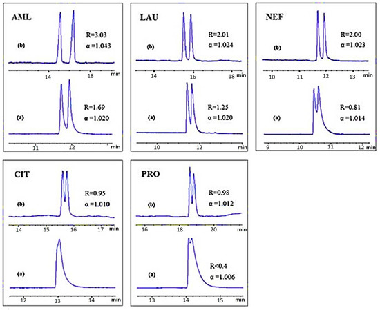 Effect of ionic liquid coated-MWCNTs on the enantioseparation of five drug enantiomers PRO: propranolol, AML: amlodipine, LAU: laudanosine, NEF: nefopam, CIT: citalopram “Reproduced with permission from Q. Zhang et al. [115]. Copyright Wiley, 2014”. (a) In the absence of ILs-MWCNTs in the running buffer; (b) In the presence of ILs-MWCNTs in the running buffer.