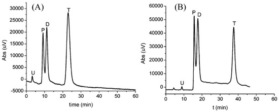 Effect of SWCNTs-coated monolithic column on the separation of a mixture containing phenol (P), toluene (T), uracil (U) and N, N-diethyl-m-toluamide (D) “Reproduced with permission from Y. Li et al. [49]. Copyright American Chemical Society, 2005”. (A) Reference column; (B) SWCNTs-coated monolithic column.