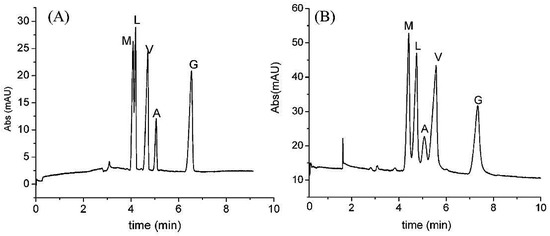 Effect of SWCNTs coated monolithic column on the separation of a peptide mixture “Reproduced with permission from Y. Li et al. [49] Copyright American Chemical Society, 2005”. (A) Polymer monolithic column containing SWCNTs; (B) Polymer monolithic column in the absence of SWCNTs, Val-Tyr-Val (V), leucine enkephalin (L); (A) angiotensin II, methionine enkephalin (M), Gly-Tyr (G).