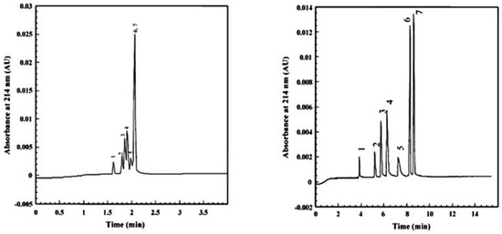 Incorporation of SWCNTs in the polymer mixture of a monolithic column resulted in a slight change in the pore size and significant increase in the surface area [49]. As well, the incorporation of SWCNTs in the polymer mixture monolithic column was found to increase the retention time and improve the separation of a peptide mixture including angiotensin, Val-Tyr-Val (V), leucine enkephalin (L), II (A), methionine enkephalin (M), Gly-Tyr (G) (Figure 10) [49]. The order of elution of these peptides by the monolith column containing SWCNTs was different from the column that did not contain carbon nanotubes (Figure 10) [49]. Collectively, CNTs in a polymer-based monolithic column were found to alter the retention times and improve the separation of some compounds and peptides in micro-HPLC and CEC [49].
