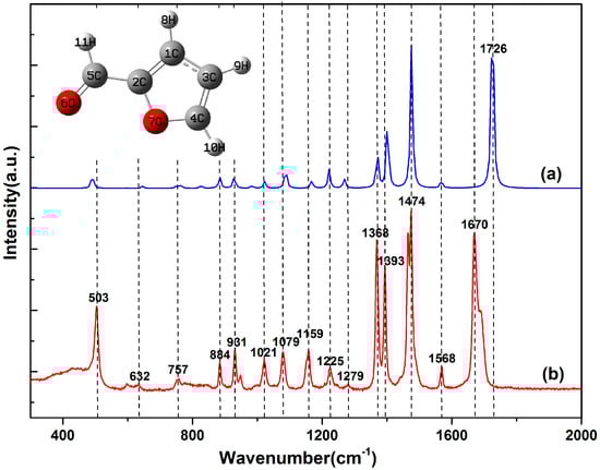 Raman spectra of pure furfural molecules: (a) Calculations and (b) Experimental measurements. The inset depicts the molecular structure of furfural molecule.