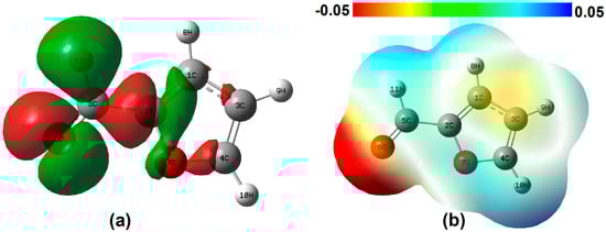(a) Charge difference densities of furfural (the green and red stand for holes and electrons, respectively); (b) The static potential distribution of furfural (the red and blue represent low potential and high potential, respectively).