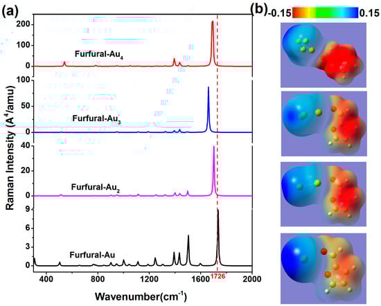 (a) The theoretical Raman spectra of furfural-AuX complexes with different atomic numbers (red dotted lines indicate characteristic peaks 1726 cm−1); (b) The static potential distribution of furfural-Aux (x = 1, 2, 3, 4).