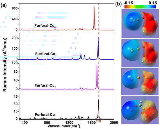 (a) The theoretical Raman spectra of furfural-Cux complexes with different atomic numbers (red dotted lines indicate characteristic peaks 1726 cm−1); (b) The static potential distribution of furfural-Cux (x = 1, 2, 3, 4).