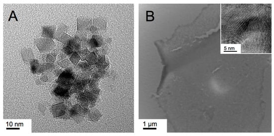 Transmission electron microscopy (TEM) images of previously synthesized IO nanostructures: (A) polyhedral nanobricks prepared by co-precipitation of Fe(III)- and Fe(II)-precursors (2:1 ratio) in the LLC phases (lamellar and hexagonal columnar) of Triton X-100 or Triton X-45 in H2O []. Using TEM tomography the height of the nanobricks was determined to be ~5 nm. Reproduced from Ref. [] with permission from The Royal Society of Chemistry; (B) Large nanosheets (lateral dimensions up to several micron) prepared in the Colh LLC phase formed by Triton X-100 in water using the reduction/hydrolysis method feature heights of 5 or 10 nm (inset shows higher resolution) []. Reproduced from Ref. [] with permission from The Royal Society of Chemistry.