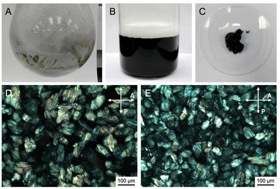 (A) Photograph showing the froth formation during after NaBH4 addition; (B) Photograph showing the diluted froth solution from which as-synthesized nanostructures were isolated by magnetic separation and washing (see experimental section). For the complete experimental setup see photographs in the Supplementary Information; (C) Photograph showing the gel fraction that has undergone separate magnetic separation and washing; (D,E) Polarized light optical photomicrographs (crossed polarizer P and analyzer A) of the hexagonal columnar phase of one of the used surfactants (here CTAB) in water: (D) prior to the addition of the Fe(III)-precursor and (E) from a small sample taken during the reaction (The fact that no difference could be detected in the polarized optical microscopy (POM) textures prior to and after addition of the reducing agent indicated the persistence of the ColhI phase as the reaction proceeded).