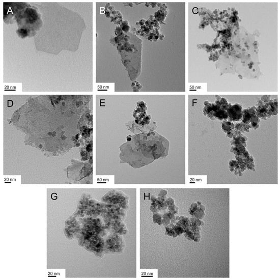 In numerous instances, running the reaction at room temperature or below proved to be challenging because of the too high viscosities of the bulk LLC phases. For the syntheses with Triton X-45, all reactions were performed at 40 °C. We first varied the concentration of the FeCl3·6H2O (1 vs. 2 mmol), then the concentration of the surfactant (20 vs. 50 wt %), and finally the type of Fe(III) precursor (chloride vs. acetylacetonate or acac). The TEM images of the representative products are shown in Figure 3. A first, general observation regarding the obtained nanostructures is that the froth fractions (Figure 3A,C,E,G) consist of nanosheets with a varying amount of smaller nanoparticles in the size regime of 15 to 20 nm in diameter. The gel fractions, with the exception of the synthesis with the double amount of FeCl3 (2 mmol vs. 1 mmol as in all other cases; Figure 3C,D), contained larger proportions of or even exclusively nanoparticles (Figure 3F,H).