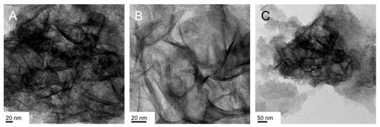 The “crumpled” nanosheets (especially those shown in Figure 4A,B) closely resembled the product obtained in the absence of a surfactant described earlier. Significantly smaller sheets, which overlap and appear to fold into each other, can be seen in the representative TEM images shown in Figure 4. Their lateral dimensions rarely exceeded a few hundred nanometers, as can be seen in Figure 4C.