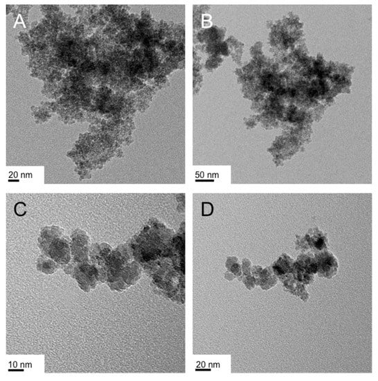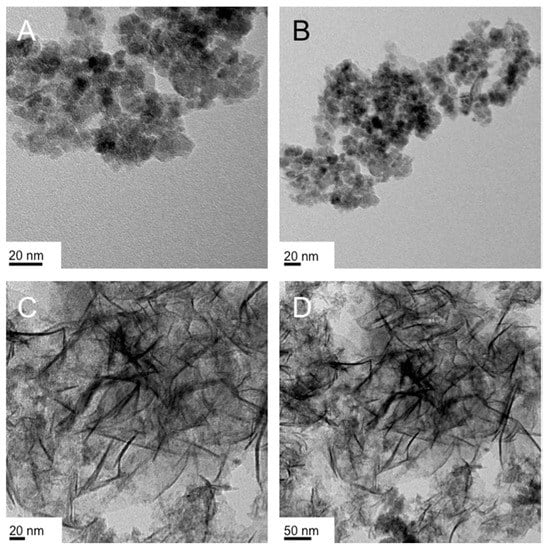 Figure 5 and Figure 6 show representative TEM images of both syntheses and the characteristic products obtained from both gel and froth fraction. The first key observation when analyzing these two sets of TEM images is that the products (i.e., the morphology of the obtained nanostructures) are very different despite the fact that the differences between both syntheses are only the surfactant concentration and the reaction temperature. The second important observation is that the synthesis at higher surfactant concentration (and lower temperature) produced two entirely different product morphologies, nanoparticles in the size regime of 10 nm in the froth fraction (Figure 5A,B) and the earlier (for Triton X-100 in the Lα phase, Figure 4) described ‘crumpled’ nanosheets (see Figure 5C,D).