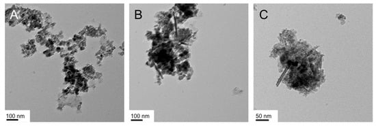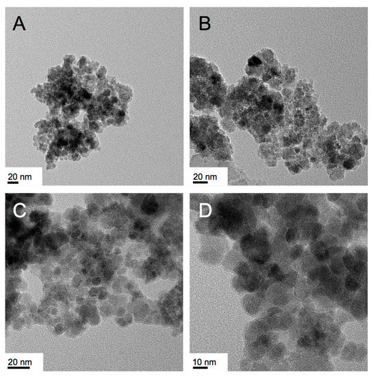 Finally, exchanging the iron(III) precursor from FeCl3 to Fe(acac)3 led again to the rough-edged quasi-spherical nanoparticles (Figure 11) obtained earlier from the reduction/hydrolysis reaction of Fe(acac)3 in the ColhI phase formed by CTAB in H2O (see Figure 8A,B). Considering our original report of this reduction/hydrolysis reaction to obtain pure magnetite (Fe3O4) nanoparticles using Fe(acac)3 as sole iron precursor [], it appears that the acac ligand, perhaps because of its effect on the iron(III) precursor’s solubility or reactivity, favors the formation of quasi-spherical nanoparticles over flat nanosheet or nanodisc-like morphologies as in the case of iron(III) precursors with chloride counter-ions. The reaction is in both cases incredibly fast (a few minutes), but it is conceivable that acac as bidentate ligand binds to initially-formed nanoparticles, preventing any coalescence to larger, flat sheet- or disc-like nanostructures.