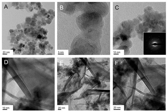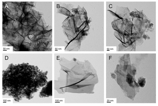 At the lower concentration of CTAB in H2O (3.6 wt %, i.e., in the aqueous solution featuring spherical micelles) the froth fraction contained, as in several syntheses before, ‘crumpled’ sheets, consistently thin with an average height of about 5 nm (Figure 9A–C). The gel fraction (Figure 9D–F) contained two distinct products with respect to shape, which in some cases could be separated by meticulous washing, magnetic separation and/or centrifugation. As shown in the TEM images, the two shapes are either nanoparticles with a quite significant size distribution (ranging from 10 to 50 nm in diameter) as well as extended nanosheets (Figure 9E) with lateral dimensions of several hundred nanometers.