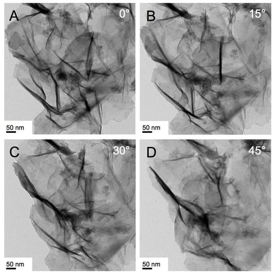 TEM tomography images (various degrees of tilt) of crumpled IO nanosheets obtained via the reduction/hydrolysis reaction of FeCl3 in the isotropic micellar liquid (spherical micelles) formed by CTAB (3.6 wt %) in water at 50 °C (froth fraction).