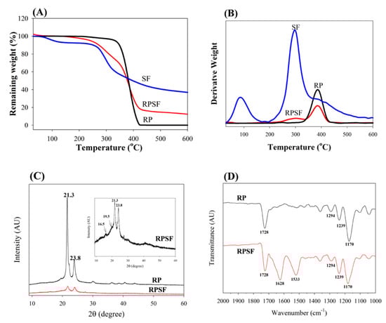 A thermogravimetric analysis (TGA) and derivative thermogravimetric analysis (DTA) were performed to evaluate the thermal properties of RP and RPSF nanofibers in nitrogen atmosphere. Samples were allowed to undergo thermal decomposition at a controlled heating rate of 10 °C/min from 25 to 500 °C using TGA 2050 from TA instruments (New Castle, DE, USA). The decomposition behavior was monitored by plotting weight (%) and derivative weight (%/°C) vs. temperature (°C).
