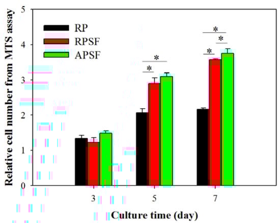 Cell proliferation was compared by determining the viable cell number from 3-(4,5-dimethylthiazol-2-y1)-5-(3-carboxymethoxypheny1)-2-(4-sulfopheny1)-2H-tetrazolium (MTS) assays at different time points (day 3, 5 and 7) and normalized to the cell number of each scaffold at day 0 (Figure 4). All scaffolds have a similar relative cell number on day 3, with no significant difference. Although RPSF and APSF have no significant difference in cell number on day 5, both groups have a significantly higher relative cell number compared with RP on day 5 and 7. SF in composite nanofiber scaffolds were shown to promote cell proliferation for chondrocytes, osteoblasts and mesenchymal stem cells [34,35]. Furthermore, an additional contribution from blending PCL with SF may be the enhancement of the hydrophilicity of the nanofiber scaffold, as a balance between the hydrophilicity and hydrophobicity of a scaffold was reported to exert positive effects on cell growth [36]. The introduction of biological functional groups, such as –NH2 and –COOH, via SF in RPSF and APSF may also enhance cell proliferation as they were shown to promote cell-scaffold recognition and subsequent proliferation [37]. Considering the effect of fiber alignment, APSF showed no significant difference in relative cell number from RPSF on day 5, but showed significantly higher relative cell number on day 7. Indeed, the physical cue from fiber alignment may further contribute to promote cell proliferation.