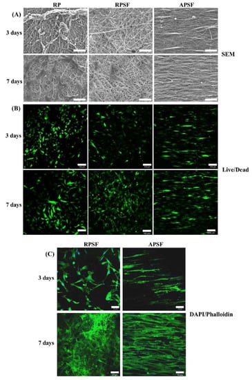 Figure 5A shows the morphology of RDFBs adhered on RP, RPSF, and APSF after cultured for 3 and 7 days. The SEM micrographs on day 3 indicate that cells attached to RP scaffolds had a lower degree of spreading with hindered cytoskeletal extensions compared with RPSF, which is consistent with previous reports that electrospun SF nanofibers could promote keratinocytes and fibroblast adhesion and spreading [38,39]. However, the morphology of attached cells on APSF was significantly different, as the aligned structural arrangement of APSF induced cells to migrate and proliferate in the direction of the nanofiber. On day 7, in which the cells completely attached themselves to the nanofibers, the filopodial extensions were much more visible and higher compared to day 3, irrespective of the random or aligned fiber morphology. The cell distribution on RP and RPSF was more scattered, whereas that on APSF was more aligned with a higher cell density, which is consistent with the viable cell number assay from Figure 4. Based on SEM observation, we conclude that the aligned structural arrangement of APSF aided the oriented growth of RDFBs and provided a favorable environment for cell attachment and proliferation.