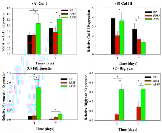 Gene expression of (A) type I collagen (Col I); (B) type III collagen (Col III); (C) fibronectin and (D) biglycan in random PCL (RP), random PCL/SF (RPSF) and aligned PCL/SF (APSF) nanofiber scaffolds by quantitative real-time polymerase chain reaction (qRT-PCR). * p < 0.05.