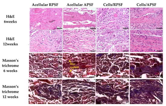 Tissue section staining using hematoxylin-eosin (H&E) and Masson’s trichrome after 6 and 12 weeks. RPSF: random PCL/SF nanofiber scaffolds. APSF: aligned PCL/SF nanofiber scaffolds. Bar = 50 μm.