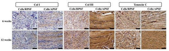 Col I is the predominant protein in tendon, making up 86% of the dry weight of the tissue [44]. It is secreted by cells at maturation and evaluation of its presence in implanted samples could confirm tissue reconstruction. At week 6, Col I secreted by cells in RPSF was minimal in contrast to higher Col I production in APSF. At week 12, the deposition of Col I in APSF increased and the distribution became more aligned along the direction of cell distribution. Although Col I also showed an increasing trend from 6 to 12 weeks in RPSF, its content was much lower in comparison with APSF. This result indicated that aligned nanofiber scaffolds promote Col I production in vivo and is in line with the in vitro gene expression results in Figure 6. The physical cues from electrospun nanofibers was suggested to affect cell behavior and fate, as aligned nanofibers induced ligament fibroblast alignment and Col I production [45].