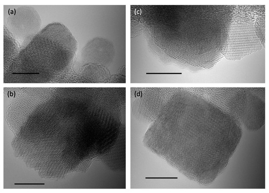Aberration-corrected TEM micrographs of nearly defect-free highly crystalline surface of IONPs’ samples 4 (a,b) and 6 (c,d). All scale bars are 10 nm.