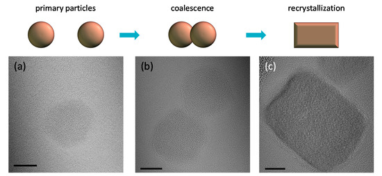 TEM micrographs and the corresponding scheme of growth from spherical primary particles (PPs) in sample 1 (a) by coalescence of PPs into secondary particles (SPs) in sample 2 (b) and their further recrystallization in sample 3 until rectangular and cubic shapes in sample 4 (c). All scale bars are 5 nm.