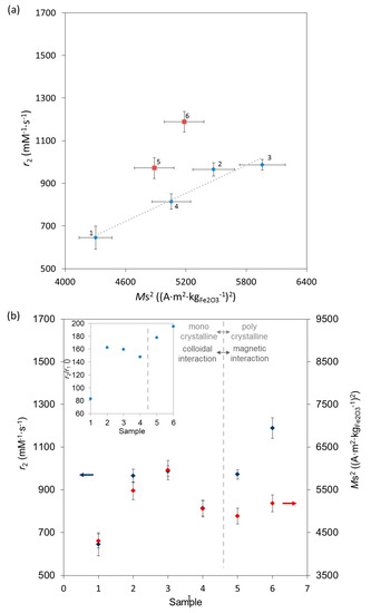 (a) MRI transverse relaxivity (r2) as a function of square of corresponding saturation magnetization (Ms) shows increase except for the samples 5 and 6 (marked red); (b) r2 in blue and (Ms)2 in red, given versus samples of IONPs along with the increased duration of the HT treatment. Insert shows the relaxivity ratio (r2/r1) versus samples.