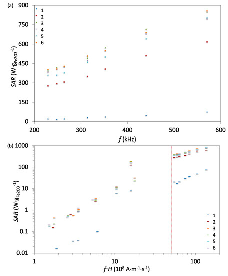 (a) SAR values as a function of frequency at the field amplitude of 23.9 kA·m−1 measured for all 6 samples. (b) SAR values as a function of the f·H product for measured values of f and H. The vertical dashed lines indicate two biological limits for the f·H product depending of the exposed volume, which corresponds to indicated hyperthermia coil size.