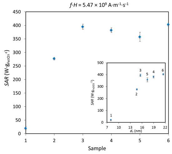 The variation of SAR is typically plotted versus dT (see insert in Figure 7). From the theory for superparamagnetic MNPs, for constant f and H, SAR should increase with the TEM size until a maximum, followed by a decrease [59,64,65]. We indeed observed this behavior for the first 5 samples, but SAR increased again in sample 6 (see Figure S15 for SAR vs. dT at other f·H values). One would expect that an increase in diameter of IONPs coupled with the formation of grain boundaries in polycrystalline sample 6 would lower SAR, as already reported [66]. Instead, an increase in SAR of sample 6 can be explained by dipolar interactions, which were already observed for these polycrystalline IONPs and which are known to enhance SAR values [67,68]. We have to note that an abrupt jump in SAR values was observed between samples 1 and 2, as for r2. Taking into account the “peanut-shaped” morphology of IONPs in sample 2, these IONPs can be viewed as short magnetic chains consisting of minimum two units and a chain formation is known to increase r2 and SAR [67,69].