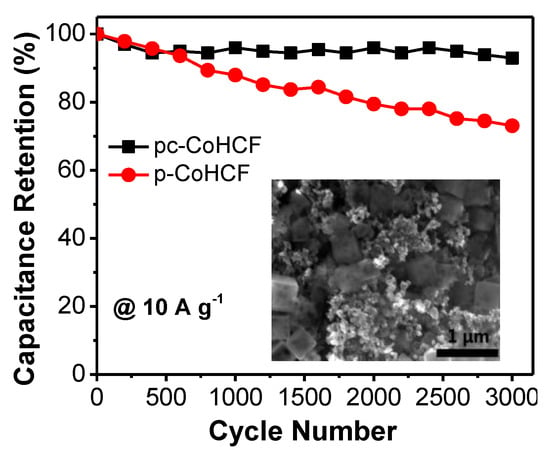 - Zhao, F.; Wang, Y.; Xu, X.; Liu, Y.; Song, R.; Lu, G.; Li, Y. Cobalt hexacyanoferrate nanoparticles as a high-rate and ultra-stable supercapacitor electrode material. ACS Appl. Mater. Interfaces. 2014, 6, 11007–11012. [Google Scholar] [CrossRef] [PubMed]