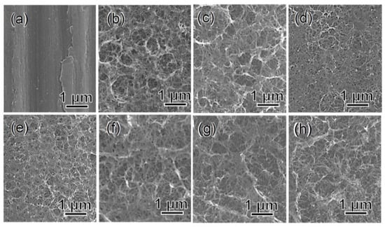 FE-SEM photographs of surfaces of Ti (a) untreated or subjected to (b) NaOH treatment, and subsequent (c) 100Ca + 0.05Ga and (d) heat treatment, and finally (e) water treatment, or (f) 100Ga after the NaOH treatment, and subsequent (g) heat and finally (h) water treatment.