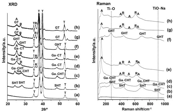 XRD and Raman spectra of surfaces of Ti (a) untreated or subjected to (b) NaOH treatment, and subsequent (c) 100Ca + 0.05Ga and (d) heat treatment, and finally (e) water treatment, or (f) 100Ga after the NaOH treatment, and subsequent (g) heat and finally (h) water treatment. T: α-Ti A: Anatase R: Rutile SHT: NaxH2−xTi3O7 Ga–CHT: GaxCayH2-(3x+2y)Ti3O7 GHT: GaxH2−3xTi3O7. Ga–CT: GaxCa1−1.5xTi4O9, GaxCa1−1.5xTi2O4, GaxCa1−1.5xTi4O5 GT: Ga2TiO5.