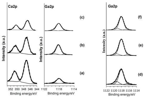 XPS profiles of Ca2p and Ga2p on Ti subjected to (a) 100Ca + 0.05Ga; (b) subsequent heat, and (c) final water treatment, or (d) 100Ga; (e) subsequent heat, and (f) final water treatment. Thick line represents spectrum. Thin lines represent deconvolution lines. Dot line represents composite line.