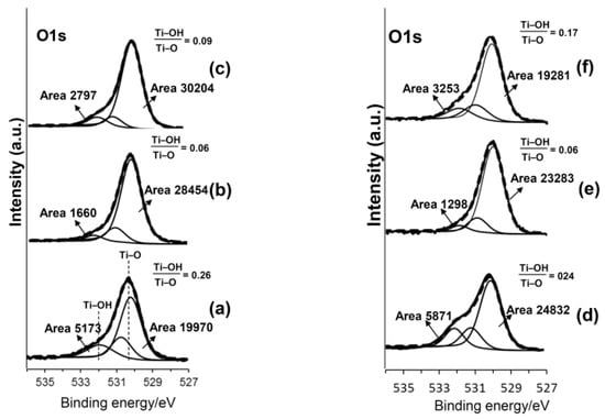 - Sham, T.K. X-ray photoelectron spectroscopy (XPS) studies of clean and hydrated TiO2 (rutile) surfaces. Chem. Phys. Lett. 1979, 68, 426–432. [Google Scholar] [CrossRef]