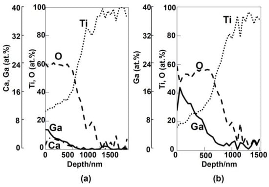 Figure 5 shows the depth profile of the XPS spectra of the Ti subjected to the 100Ca + 0.05Ga or 100Ga treatment after the NaOH treatment followed by heat and water treatments. Enrichment of Ca and Ga were observed near the surface in the former sample in addition to O, as shown in Figure 5a. They gradually decreased with increasing depth up to a thickness of approximately 1 μm. Substantially larger amounts of Ga were detected on the surface of the latter sample, as shown in Figure 5b.