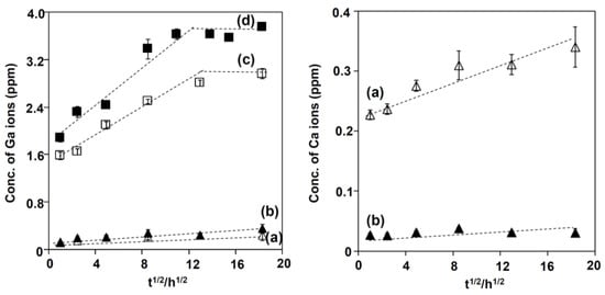 Concentrations of Ga and Ca ions measured by ICP (inductively coupled plasma emission spectroscopy), which was released from Ti subjected to (a) NaOH; 100Ca + 0.05Ga and heat treatment, and subsequent (b) water treatment; or (c) NaOH, 100Ga and heat treatment, and subsequent (d) water treatment as a function of square root of soaking time in PBS.