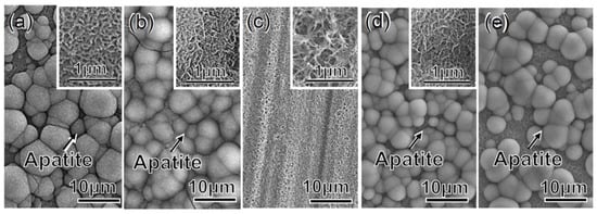 FE-SEM photographs of surfaces of Ti soaked in SBF for 3 days following (a) NaOH, 100Ca + 0.05Ga and heat treatments, and finally (b) water treatment, or (c) NaOH, 100Ga and heat treatments and finally (d) water treatment. Apatite formation of Ti subjected to the treatment of (d) followed by a storage under 95% relative humidity at 80 °C for 7 days is shown in (e). The insets in (a–d) show high-magnification images.