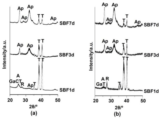 TF-XRD profiles of the Ti surfaces soaked in SBF for different days after (a) 100Ca + 0.05Ga, heat and water or (b) 100Ga, heat and water treatments following the NaOH treatment. T: α-Ti Ap: Apatite A: Anatase R: Rutile, Ga-CT: GaxCa1−1.5xTi4O9, GaxCa1−1.5xTi2O4, GaxCa1−1.5xTi4O5, GT: Ga2TiO5.