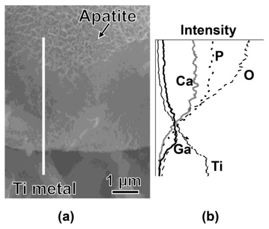 When the Ti was soaked in 100 mM GaCl3 solution after the NaOH treatment, 8.0% Ga was incorporated into the metal surface, forming gallium hydrogen titanate (GHT). Most of the Ga ions were located in the interspaces of GHT whereas some were at the Ti4+ site, as seen in the case of Ga–CHT. The GHT became dehydrated and transformed into gallium titanate (GT), rutile and a small amount of anatase by the heat treatment. The treated metal did not form apatite in SBF within 3 days, but formed a marked amount apatite particles after the final water treatment, as shown in Figure 7c,d. The increased apatite formation by the final water treatment might be attributable to the increased Ga ion release as well as abundant Ti–OH groups, as shown in Figure 4c and Figure 6d. The concentration of Ga in PBS become 1.88 ppm after 1 h, and slowly increased up to 3.75 ppm after 7 days, which remained there until after 14 days. When the treated metal was soaked in SBF, it is assumed that Ga ions were also released into SBF so as to increase the pH of the surrounding fluid via an exchange with H3O+ ions, and therefore formed Ti–OH groups on the metal surface, as in the case of the Na ions in the sodium titanate that was formed on Ti [43]. The Ti–OH groups become negatively charged in an alkaline environment [44], and combine with the positively charged Ca ions and, subsequently, negatively charged phosphate ions in the SBF. As a result, an amorphous calcium phosphate is formed, which is eventually transformed into crystalline, bone-like apatite [45]. Thus, the formed apatite becomes integrated with the nanostructured surface layer by growing into a uniform layer of about 4 μm in thickness, as shown in Figure 9. It was evident from the EDX line analysis in Figure 9 and XPS profiles on apatite far from the surface layer in Figure 10 that a small amount of Ga ions was taken into the apatite precipitated in SBF. It is reported that Ga ions in physiological saline solution supersaturated with Ca and PO4 preferentially adsorbed on apatite crystal to reduce the rates of direct precipitation of apatite, transformation of amorphous calcium phosphate to apatite and growth of apatite seed crystals when the concentrations of Ga ions in the solution were more than 7, 17.5, and 1.75 ppm, respectively [46]. In the present study, no distinguishable differences were observed in terms of the crystallinity of the apatite formed on Ti with Ga–CT and GT regardless of the difference in their capacities for Ga release, as can be seen from Figure 7 and Figure 8. This might be due to the relatively small Ga ion amounts (maximum at 3.75 ppm) compared to the reported value. The capacity of apatite formation on the metal, treated in this manner, was essentially maintained, even in 95% relative humidity at 80 °C for at least 1 week, as shown in Figure 7e.