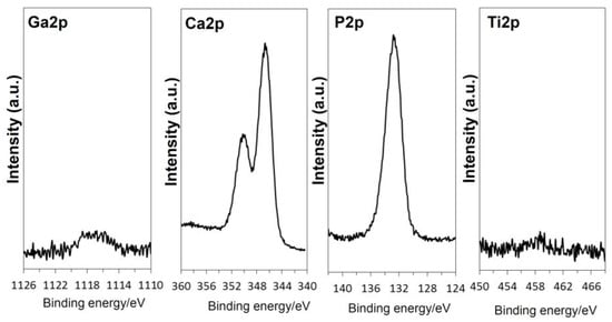 The sample formed with apatite by soaking in SBF for 7 days after the NaOH, 100Ga, heat and water treatments was subjected to cross-sectional FE-SEM observation and EDX line analysis to examine the Ga distribution on the surface of the metal (Figure 9). It was found from the FE-SEM photographs (Figure 9a) that apatite particles filled the spaces of the nano-structured surface layer and grew into a uniform layer approximately 4 μm in thickness. It was shown by EDX line analysis (Figure 9b) that a relatively large amount of Ga was detected in the region where Ti started to decrease, and it gradually decreased along with a decreasing Ti. A certain amount of Ga was detected even near the top surface, where Ca and P, which are components of apatite, were dominant. These results imply that Ga distribution was not limited in the surface GT layer, but also regions far from the GT layer. It was evident from the high-resolution XPS spectra of the Ga2p, Ca2p, P2p, and Ti2p taken on the top surface of the sample, shown in Figure 10, that a small amount of Ga was detected along with a large amount of Ca and P, even on the top surface of the apatite layer, while Ti was not detected.